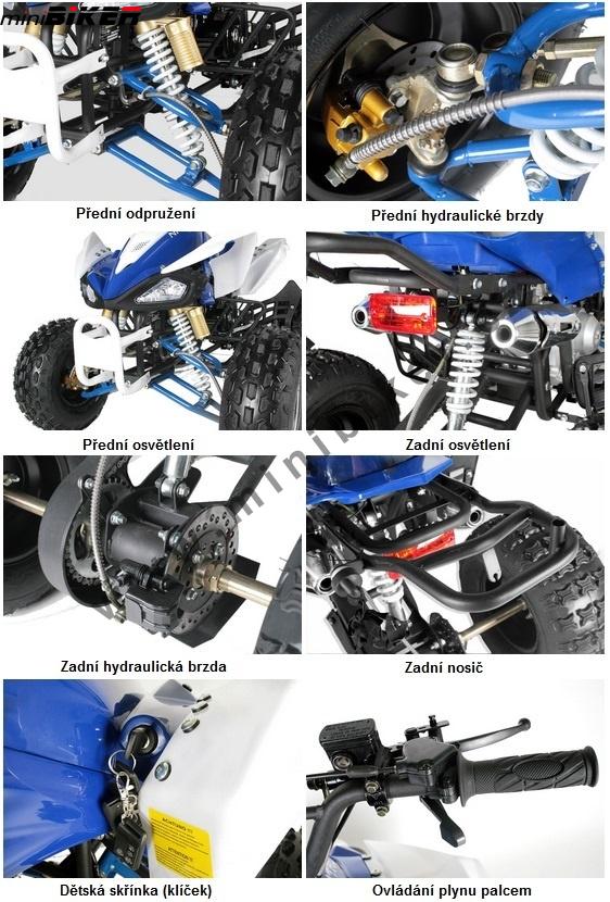 čtyřkolka se sportovním designem je vhodná pro uživatele s výškou postavy cca od 130cm do 170cm. 2 výfuky, velká kola 8", přední nárazník a bezpečný rám, kryt řetězu, elektrický startér, přední a zadní kotoučové hydraulické brzdy, parkovací brzda, čirá optika, zadní nosič, výtrhová pojistka. Nastavitelná tuhost zadního odpružení. Čtyřkolka má poloautomatickou převodovku, řadí se 1-2-3 nebo zpátečka, bez použítí spojky. + dálkové vládání, sportovní vzduchový filtr, sportovní výfuk, osvětlení