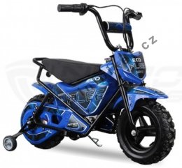 dětská elektrická motorka pro nejmenší, osazena motorem o výkonu 250 Wattů, který dokáže motorku rozjet rychlostí až 20 km/h (dle váhy uživatele a terénu) s možností omezení na cca 8 km/h pouhým přepnutím tlačítka, které je umístěno na bezpečném místě uvnitř oplastování. Tato dětská motorka má zadní kotoučovou brzdu, LED indikátor stavu baterií, je vyrobena z kvalitního materiálu, má kovový rám, pevné oplastování, gumové nafukovací pneumatiky 6,5 palce a její nosnost je až 50 kg. Součástí elektrické motorky jsou také přídavná kolečka, stojánek a samozřejmě nabíječka. Motorka má plynulé přidávání plynu rukojetí. 2 baterie 12V jsou zárukou dlouhého dojezdu až 10 km (dle zatížení a terénu)